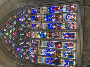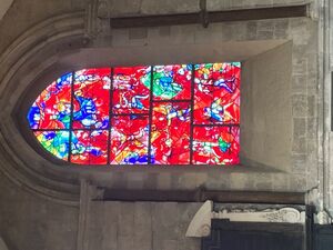 Also the 2 beautiful modern tapestries were really quite stunning. As were the stained glass windows. The south window, dated 1877, showed scenes from both the Old and New Testament. But the window which impressed us all was the Chagall Window from 1978. The strong colours and figures just shone.